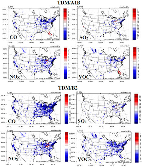 Emission projections are critical elements in understanding future climate impacts at global and regional scales. One of the deficiencies for many current emission projections [1] is the lack of a clear or explicit relationship between socioeconomic factors and projected technology change. Thus, the TDM approach [25,26,27,54] has been developed to help close the gap between socioeconomic factors and projected technology change. This model is based on the Speciated Pollutant Emission Wizard (SPEW)-Trend model [54], which is a hybridization of engineering (“bottom-up”) and economic (“top-down”) models. Yan et al. (2011, 2014) described how the mix of technologies is determined dynamically by deriving explicit relationships among socioeconomic factors and technological changes [25,54]. The SPEW-Trend model is driven by variables taken from IPCC SRES (e.g., A1B and B2), including fuel consumption, population, and gross domestic product. SPEW-Trend determines the final emission projections of the major anthropogenic transportation, power plant, industrial, and residential sectors. The projected emission growth factors are further apportioned to each U.S. state for all anthropogenic emission sectors by their current and future energy consumption data, which is derived from business-as-usual trends reported in the Department of Energy’s 2013 Annual Energy Outlook [55]. Consequently, the growth factors used here are specific to each U.S. state and IPCC emission projection scenario, and thus are highly detailed compared with other emission projection methods and applications. Further details on the SPEW-Trend model and emission projection factors used here may be found in previous work [25,26,54].