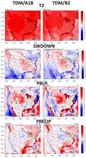 For the TDM/B2 scenario, the domain average T2 increases by ~2 °C with grid cell maximum T2 increases by 5.1 °C, mainly over the north-east-central and east-coast U.S. (Figure 2). The spatial pattern of T2 for TDM/B2 is similar to TDM/A1B, but with lesser increases in eastern and southern U.S. compared with TDM/A1B. The spatial changes of Q2 are also similar to TDM/A1B (Figure S4); however, there are smaller increases in Q2 under TDM/B2 compared with TDM/A1B due to the smaller increases in T2 (i.e., less water vapor holding capacity). The largest increases in WS10 occur in coastal areas of the U.S. and central Canada and are associated with correlated increases in T2. We note that there are also very small decreases in WS10 in the western and central U.S. (Figure S4). The large increases in PBLH over the central and coastal regions of the U.S. are due to increases in T2 and WS10, with small decreases in PBLH in western and southwestern U.S. (Figure 2). In general, the increased WS10, PRECIP, and PBLH also suggest an increased frequency of Atlantic storms in the TDM/B2 scenario. The changes in PRECIP also show a similar trend to the changes in Q2, i.e., the largest increases in precipitation occur over the ocean and near the coastal areas, while for the central U.S., there is a decrease in precipitation (Figure 2). The spatial pattern of PRECIP for TDM/B2 is similar to TDM/A1B. This trend is similar to the results from previous studies using the RCP scenarios, which also show the largest increase in PRECIP over the southeastern U.S. [13,23] There is a domain-wide decrease in SWDOWN of ~0.9 W m−2 but a much larger increase in SWDOWN of about 0 to 4 W m−2 over the central U.S. The SWDOWN is projected to increase over the central U.S. due to increase in GHGs leading to overall warmer T2, deeper PBLHs, smaller (or decreased) Q2, and reduced cloud formation feedbacks from aerosol reductions over these inland regions (see Section 4.4 for more discussion). The trend for OLR is also similar to TDM/A1B with an increase over land by ~1.3 W m−2 (Figure S4). The downward longwave radiation (not shown) increases with a domain average of ~11.0 W m−2 due to increases in GHGs in the future scenario.