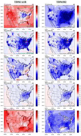 For the TDM/B2 scenario, the projected MDA8 h O3 has widespread decreases over most of the U.S. with a domain average decrease of ~2.5 ppb, with the exception of major urban cities in California and in some parts of northeastern U.S. and Florida, where there remain localized MDA8 h O3 increases (Figure 3). These localized MDA8 h O3 increases (maximum increase of ~20 ppb) are located in VOC-limited O3 chemistry regions where there is a larger TDM NOx emission reduction than VOC emission reduction. A similar pattern is also found from the RCP4.5 simulation by Yahya et al. (2017) [23]. According to Yahya et al. (2017), the O3 mixing ratios are projected to decrease in future decades over most parts of the U.S., with a domain-average decrease of ~2 ppb with the exception of major urban cities in California and over the northeastern U.S., where O3 mixing ratios are projected to increase with a maximum increase of ~10 ppb [23]. Therefore, in both TDM/A1B and TDM/B2 scenarios, the MDA8 h O3 is projected to increase near the major cities; however, the changes in MDA8 h O3 in the surrounding rural/suburban areas outside of cities will be strongly governed by future background GHG concentrations and future climate change.