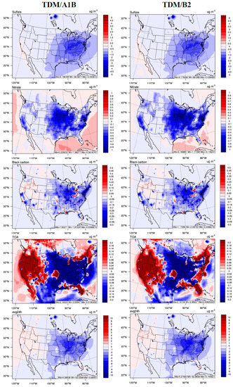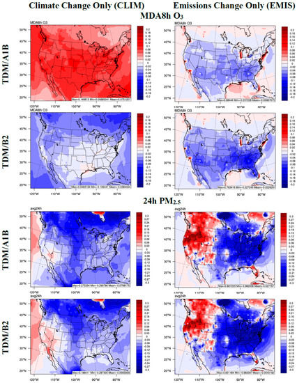 It is difficult to find similar studies that have the same domain coverage, projection period, and averaging intervals, which leads to difficulty in making true “apples-to-apples” comparisons across different projection methodologies. Clearly, in our work, the inclusion of explicit TDM emission projections and increasing background GHGs leads to larger potential increases in O3 by 2050 in some U.S. regions compared with other previous studies. For PM2.5, the future air quality features greater reduction in PM2.5 by RCP 8.5/4.5 studies [23] than our TDM A1B/B2 work here, which is due to the inclusion of more explicit changes in precursors and primary emissions in the TDM approach. Our work does corroborate other studies that have shown future PM2.5 decreases in the southeast U.S. (annual average of ~1.0 µg m−3) [7]; however, we present larger magnitude decreases using the DA24 h analysis pertinent to shorter term exposure effects.