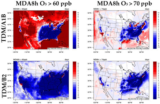 Ozone exceedance days are defined as the cumulative days with an MDA8 h greater than 70 ppb, which is the current O3 National Ambient Air Quality Standard (NAAQS), and for an MDA8 h O3 greater than 60 ppb, which reflects a possible lowering of the NAAQS in the near future (i.e., potential future national standards) [59]. The number of exceedance days of MDA8 h O3 > 70 ppb is significantly reduced but some areas remain in non-attainment, i.e., parts of California, Miami, Ohio River, the Great Lakes, and New York. The number of days of MDA8 h O3 > 60 ppb will increase over the U.S., except for the eastern U.S. and in some parts of California (Figure 5). While the overall MDA8 h O3 increases widely for the TDM/A1B scenario (Figure 3), the results here suggest that daytime O3 exceedances in the future may be reduced (i.e., a flattening of the diurnal O3 curve) in the eastern U.S., even in the advent of more stringent air quality regulations and lowering of the NAAQS for ozone (i.e., MDA8 h O3 > 60 ppb). Under more stringent regulations in the western U.S., however, more daytime O3 exceedances are projected under the future TDM/A1B scenario. Under the relatively more controlled TDM/B2 emission scenario, the daytime O3 exceedances in the future are reduced across the entire U.S. (Figure 5), except for some coastal/Great Lake regions, and in Los Angeles, CA, which may experience photochemical O3 regime shifts with such profound decreases in NOx emissions (i.e., potential shifts from VOC- to NOx-limited conditions in urban areas).