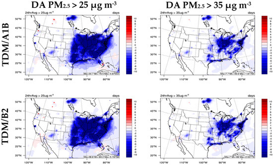 PM2.5 exceedance days are defined as the cumulative number of days with an average 24-h PM2.5 concentration greater than 35 µg m−3, which is the current PM2.5 NAAQS, and for average 24-h PM2.5 concentration greater than 25 µg m−3, which is the current World Health Organization (WHO) 24-h PM2.5 standard. Given the large reductions in PM2.5 concentrations for both TDM/A1B and TDM/B2 described previously (see Section 4.2 and Figure 4), the future number of PM2.5 exceedance days is significantly reduced over the U.S. under both the NAAQS and WHO 24-h regulatory standards. These results indicate that O3 and PM2.5 may be better controlled by reducing emissions of their precursors and GHGs with greater benefits under TDM/B2 than the TDM/A1B scenario.