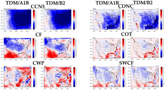 The cloud condensation nuclei at supersaturation 0.5% (CCN5) and cloud droplet number concentration (CDNC) decrease over almost the whole domain for both the TDM/A1B and TDM/B2 scenarios (Figure 7). This is due to similar decreases in PM2.5 concentration spatial distributions, again most prolific over the eastern U.S. (see Section 4.2 and Figure 4). This is to be expected, as CCN is influenced by components of PM2.5 even though large uncertainties exist [60,61]. While not shown, the decreases in near-surface PM2.5 concentrations are in good agreement with the decreases in the total 3D column aerosol abundance (i.e., aerosol optical depth). The macroscopic cloud properties such as cloud fraction (CF) and cloud water path (CWP) decrease over most parts of the land area but increase over the ocean and over a portion of the southeastern U.S. The macroscopic CF and CWP are intrinsically linked to both the larger scale climate variable changes discussed in Section 4.1 (Figure 2 and Figure S4), but are also impacted by the microscopic cloud properties such as CCN5 and CDNC (Figure 7). Ultimately, the spatial distributions of CWP changes are inherently similar to those in PRECIP (Figure 2), which are driven by the relatively larger increases in moisture (Q2; Figure S4) over and transported from the ocean in both TDM/A1B (larger in magnitude) and TDM/B2 scenarios. We note that there are increases in CWP despite decreases in CDNC in the east-southeast U.S., which suggests the presence of more water vapor for available aerosols (and CCN5), thus driving the growth of larger cloud droplets and enhanced precipitation in the future for these regions.