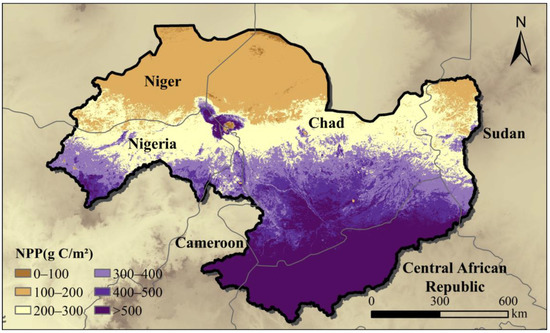 The Chad Basin in Africa is located in the center of the Sahel region, and desertification is very in this area serious [8,9]. The Conventional Lake Chad Basin (CLCB) is the most active area in the Chad Basin, and the water supply to the Chad Basin comes from this area, which belongs to the Lake Chad Basin Committee [10]. Owing to climate change, more than 90% of the water in the CLCB is lost during heat and evaporation [11]. Population growth, uncontrolled irrigation in surrounding areas, desertification, deforestation, and drought have had a significant impact on local livelihoods and survival. In recent years, with the implementation of a series of policies, the habitat quality of the CLCB has been greatly improved, which has promoted the recovery of regional vegetation and the growth of carbon sequestration. However, the specific impacts of climate change and human activities on vegetation have not been systematically analyzed [12,13]. Therefore, exploring the dynamic changes of NPP in the traditional watershed of the CLCB has important guiding significance and reference value for monitoring the ecological environment and the formulation of ecological restoration plans in this area.