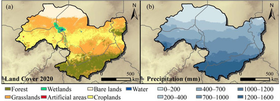 Spatial distribution of nature characteristics in the CLCB. (a) Spatial distribution of land cover; (b) Spatial distribution of precipitation.