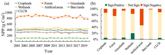 Interannual average NPP in each terrestrial ecosystem from 2001 to 2020. (a) Interannual variation trend of average NPP in the CLCB; (b) NPP variation proportion in each terrestrial ecosystem.