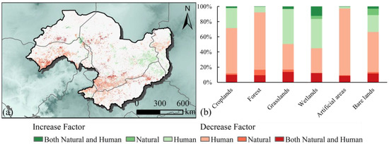Driving factors of NPP in the CLCB. (a) Spatial distribution of driving factors of NPP, including increase factors and decrease factors; (b) Proportion of different factors of each terrestrial ecosystem.