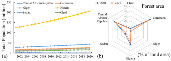 Typical characteristics of Nigeria. (a) Total population trends from 2001 to 2020; (b) Forest area variation trends from 2001 to 2020.