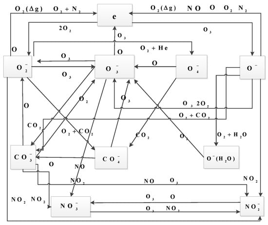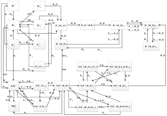 By considering the contribution of ion chemical reactions to particle density, a steady-state physical model for the D-region (60–90 km) in mid-low latitude regions is established, which considers a steady-state ion chemical framework involving 145 reactions of 23 positive ions, 11 negative ions, 12 neutral particles, and electrons. The ion–chemical scheme of the ionospheric D-region used in our model is shown in Figure 1 and Figure 2. The chemical reaction equations involved in the framework of ion chemistry and the corresponding chemical reaction rates are obtained from references [18,22,23,32,33].