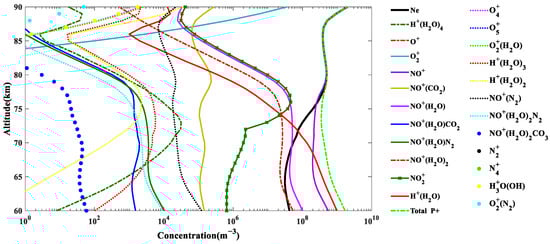 It can be seen from Figure 3 that molecular positive ions are the main components, and the proportion of atomic ions is extremely low in the D-region. In general, the concentration of the relatively large, molecular, positive ions gradually increases with the decrease of height. Above 80 km, the electron and total positive ion density are almost equal, whereas, there is a large difference between them below 80 km. The concentration of most positive ions increases with the decrease of height, and the concentration of a small amount of trace components has a peak value with the decrease of height, but these trace components have little effect on the electron density. In the D-region, NO+ accounts for a large proportion, and the electron density is greatly affected by the concentration of NO+. However, the proportion of positive ions of hydrated ions increases as the height decreases, especially below 75 km. For example, below 70 km, the proportion of H+(H2O) increases gradually with the decrease of height, and its maximum order of magnitude can reach 109 m−3, even exceeding the concentration of NO+, which has a great impact on electron density. This is because there are a large number of neutral particles, such as H2O and CO2, in the D-region, which form a large number of hydrated positive ions through physical processes, such as frequent collisions with ions.