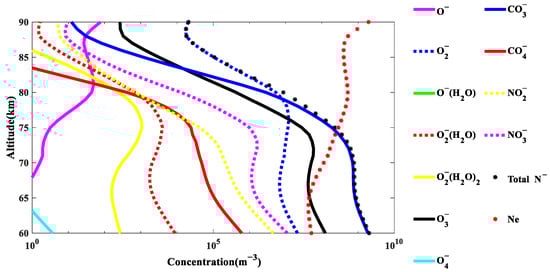 The distribution of the main negative ions is shown in Figure 4. It is shown that molecular negative ions are the main components of the D-region, and atomic negative ions account for a relatively low proportion. In general, the total negative ion density increases with the decrease of height, various molecular negative ions generally increase with the decrease of height, and mono-atomic oxygen negative ions decrease with the decrease of height. O2− is the main component of negative ions at 80–90 km, and it is gradually replaced by CO3− and O3− as the main components below 80 km. The maximum magnitude of O3− reaches 107 m−3, and the maximum magnitude of CO3− even reaches 109 m−3. Because of the overall electric neutrality of the ionosphere, when the height decreases, the negative ions gradually increase, which has a great impact on the electron density, resulting in the electron density becoming far less than the ion density. In the D-region, electrons and a large number of neutral components (such as N2, O2, and CO2) generate a large number of negative ions (such as O2−, CO3−, etc.) through attachment reaction, and then generate negative ions through the collision process, resulting in the reduction of electron density.