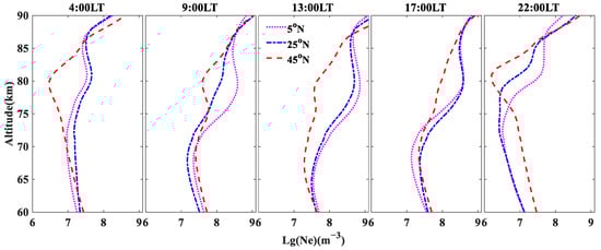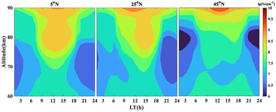 Figure 5 shows the variation of the electron density of the model with the local time, at the same longitude (103.8° E) and different latitudes (5° N, 25° N, and 45° N). It can be seen that the D-region electron density is below 1010 m−3 in the mid-low latitude, and the electron density in the daytime is higher than that at night. Further, there is a maximum value during 12:00–13:00 LT. The variation of the electron density is roughly the same at different latitudes, which increases with the decrease of the latitude, and the variation with the local time is more obvious. The possible reason is that the D-region is more affected by the photochemical process as the latitude decreases. In low latitudes (5° N and 25° N), the electron density has a maximum at 80 km in the daytime, that is, the peak height of the D-region is about 80 km, which is more obvious with the decrease of latitude. In mid latitudes (45° N), the electron density does not have a maximum in the daytime. However, there is an obvious minimum at approximately 65 km. At night, the height of the minimum electron density is the D-region lower boundary, which decreases with the decrease of latitude.