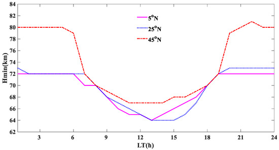 Figure 6 shows the change of the electron density with the altitude at 4:00 LT, 9:00 LT, 13:00 LT, 17:00 LT, and 22:00 LT in 2009. It can be seen that the electron density is 106–1010 m−3, and the maximum value is 5 × 109 m−3 at about 13:00 LT. Further, there is a maximal value at 80 km at about 13:00 LT in low latitudes (5° N and 25° N) from Figure 5 and Figure 6. The changing trends for different LT are the same in low latitudes. With the height decreasing, the electron density decreases firstly and then increases. It has a minimum value, and the height of the minimum value varies with the local time. There is a maximum value at about 80 km, that is, the peak height of the D-region is about 80 km. In the middle latitude, the electron density decreases firstly and then increases with the decrease of the altitude. It has a minimum value, and the height of the minimum value varies with the local time. In general, the model can better reflect the variation of the peak height of the D-region in low latitude than that in mid latitude. There may be a C-region in the mid-low latitude, and it varies with the local time. However, this still needs more research or theory to prove it in the future. Figure 7 shows the change in the height of the minimum electron density (Hmin) with the local time at different latitudes. It can be seen that Hmin in the daytime decreases firstly and then increases with the local time, reaching the minimum value at noon in the daytime. However, it remains unchanged at night. In low latitudes (5° N and 25° N), the minimum value of Hmin occurs at approximately 64 km at 13:00 LT in the daytime and 72 km at night. In the middle latitude (45° N), the minimum value of Hmin occurs at approximately 67 km at 13:00 LT in the daytime and 80 km at night. In general, Hmin increases with the increase of the latitude. The reason is that the height during the daytime is strongly correlated with the solar zenith angle. It can be seen from Figure 6 and Figure 7 that the range of the D-region in the daytime is about 64–85 km, and the lower boundary of the D-region changes with the local time within 72–85 km at night in the low latitude.