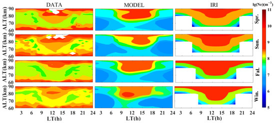 The physical model and IRI empirical model were analyzed in the same way as the MF radar data processing. Consequently, the diurnal variation of the electron density in Spring, Summer, Fall, and Winter in the low solar activity year (1 August 2008 to 31 July 2009) was obtained, as shown in Figure 8. It can be seen from the left column of Figure 8 that the data are vacant between 12:00 LT and 14:00 LT over 85 km in Spring and Summer. This is because the electron density is high at this height and time, thus the radar wave cannot be reflected after reaching this height, and the data below 65 km are large and inaccurate due to the offset absorption being very weak.