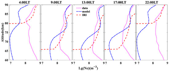 Figure 9 shows the changes in the electron density of the physical model, radar data, and IRI with the altitude at different times. It can be seen that the electron density from the radar data and IRI is about 108 m−3, which is one order of magnitude larger than the physical model at about 107 m−3 at 4:00 LT and 22:00 LT. The electron density detected by radar data over 80 km is close to the electron density calculated by IRI, which is about 5 × 108 m−3, and both of them decrease with the decrease of the height. There are a lack of values below 80 km at night in IRI, but the electron density of the radar data with the value range 108–8.8 × 108 m−3 decreases firstly and then increases with the decrease of the height at 9:00 LT, 13:00 LT, and 17:00 LT below 80 km. The electron density of the radar data increases gradually with the decrease of the altitude at 4:00 LT and 22:00 LT below 80 km. The electron density of the model is 107–108 m−3, which decreases firstly and then increases with the decrease of the height. In the daytime at 9:00 LT, 13:00 LT, and 17:00 LT, the physical model has an extreme value at about 80 km, and the radar data have a similar result at about 80 km at 9:00 LT and 13:00 LT, although not too obvious. The physical model has the minimum electron density for 66 km at 9:00 LT, 65 km at 13:00 LT, and 68 km at 17:00 LT, while the radar has it for 70 km at 9:00 LT, 66 km at 13:00 LT, and 70 km at 17:00 LT. The electron density of IRI decreases with the height, but there are a lack of values below 66 km.