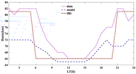 Figure 10 shows the variations over time of the minimum electron density corresponding to the height of the physical model, radar data, and IRI with local time. The height of the minimum electron density at night is almost without any change with local time. The height of the minimum electron density of the physical model is about 72 km at 0:00 LT–5:00 LT and 19:00 LT–24:00 LT, the radar data are about 81 km at 0:00 LT–6:00 LT and 21:00 LT–24:00 LT, and IRI is about 81 km at 0:00 LT–5:00 LT and 21:00 LT–24:00 LT. The height of the minimum electron density in the daytime decreases firstly and then increases with the local time, reducing the minimum at about 13:00 LT. The minimum value of the physical model occurs at about 65 km at 10:00 LT–15:00 LT, the minimum value of the radar data occurs at about 66 km at 12:00 LT–15:00 LT, and the minimum value of IRI occurs at about 66 km at 6:00 LT–20:00 LT. The results show that the minimum height of the D-region lower boundary in the low latitude is about 65 ± 1 km, and the height during the daytime is strongly correlated with the local time. Figure 9 and Figure 10 show that the D-region in the daytime is about 65–85 km. Similar results are obtained by VLF radar observation data [39]. The possible reasons are the D-region electron density is greatly affected by the solar zenith angle and mainly controlled by the photochemical process.