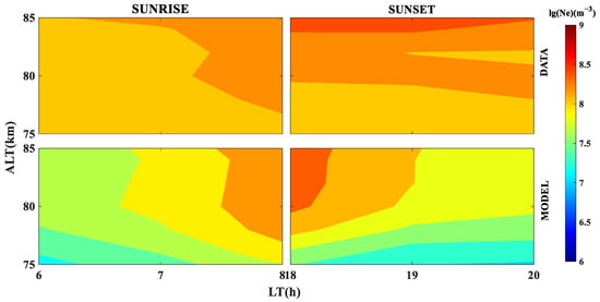 Figure 11 reveals the asymmetry between the measured electron density data and the model results for sunrise and sunset at 75–85 km. The asymmetry of the electron density means that the electron density is much higher at sunset than at sunrise. The electron density is significantly lower during sunrise when compared to sunset, as shown in the upper part of Figure 11. There is a relatively small difference in electron density during sunrise when the electron density gradually increases, as shown in the lower part of Figure 11. A possible explanation is a higher electron–ion recombination rate than the fading ionization rate during sunset. The recombination reactions are not fast enough to closely match the fading ionization rate during sunset, resulting in excess electron density [40]. At lower altitudes, electron attachment to neutrals and their detachment from negative ions play a significant role in the asymmetry, as well [41].
