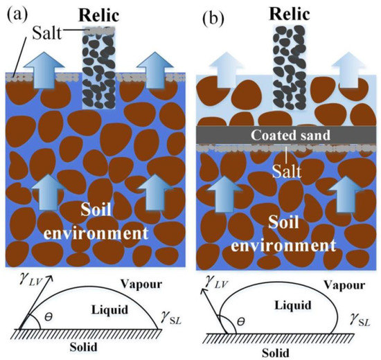 where: —surface tension of solid–vapor interface; —surface tension of solid–liquid interface; —surface tension of liquid–vapor interface. According to the range of the contact angle θ, there are many situations of moisture migration, as shown in Table 1. When θ > 90°, the water transfer ability in the soil will decrease significantly, or even not transfer at all. Based on this result, arranging coated sand for water blocking in earthen sites was proposed in this paper by taking advantage of the sign that the contact angle between water and the surface of coated sand material is greater than 90 degrees. Thus, the earthen sites above the coated sand are not wet (as shown in Figure 2b), to prevent water from passing through the soil particle gap and achieve water resistance and salt resistance.