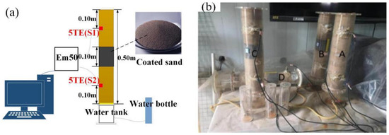 Water and salt resistance test system of coated sand. (a) Schematic diagram of the experimental setup. (b) The experiment site (A,B,C,D).