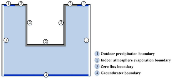 The boundary conditions of the model are shown in Figure 5. The upper surface of the model was the outdoor precipitation part and the indoor atmosphere part, which were, respectively, set as the variable flux boundary of precipitation and the boundary of atmospheric evaporation conditions (the evaporation amount was 0.2 mm/d). The wall was the indoor evaporation part, which was set as the evaporation boundary (the evaporation amount was 0.2 mm/d). If there was groundwater, the lower boundary was set as the constant head boundary. Due to the symmetry and ductility of the study area, the remaining boundary conditions were set to zero flux [32].