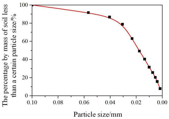 The initial state of the experimental soil and the contents of main salt ions (Cl−, SO42−, NO3−, Na+, K+, Mg2+, and Ca2+) in each stage of the experiment were obtained by ion chromatography. The distribution of experimental soil particle size was obtained by a combined screening method and densitometer method, which was used to predict soil hydraulic characteristic parameters according to soil particle size. The particle size distribution of the experimental soil is shown in Figure 6.