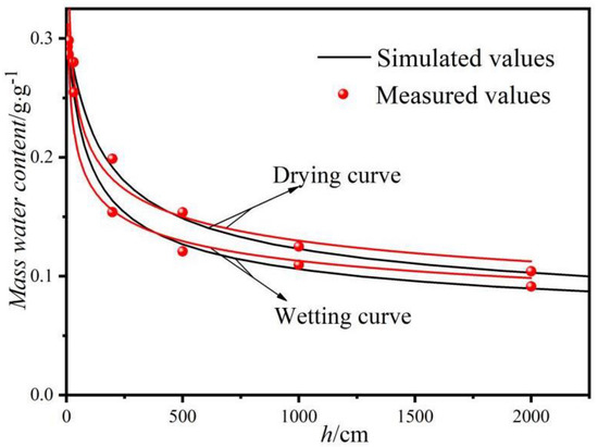 The water characteristic curve of experimental soil, including the hygroscopic curve and dehumidification curve, was obtained by the pressure membrane method. The hydraulic characteristic parameters predicted by the model could be corrected according to the results. The characteristic curves of soil water measured during the experiment and simulation are shown in Figure 7.
