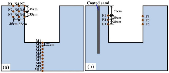Diagram of observation points. (a) Observation point of simulated water and salt migration law. (b) Observation point of water and salt resistances of coated sand is simulated.