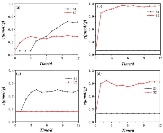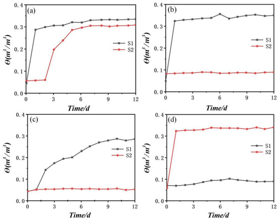 Based on the experimental system, four groups of experiments were designed in this study, A, B, C, and D, as shown in Figure 3b. Moreover, as shown in Figure 3a, the two 5TE sensors were located at 0.1 m and 0.4 m of the organic glass soil column, and S1 and S2 were used to refer to the upper and lower sensor positions, respectively. The four groups of experimental settings are shown in Table 3: