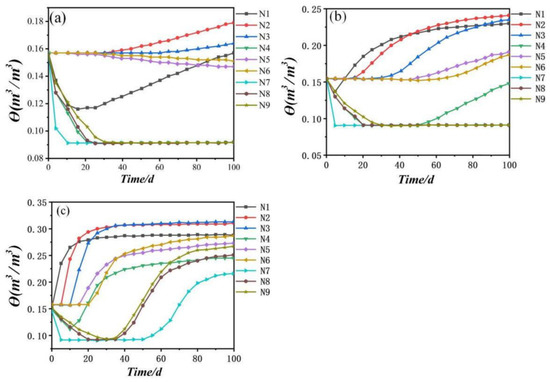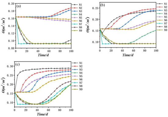 Under the condition that the indoor geometric scale remains unchanged, the daily average precipitation was set to 0.5 mm, 2 mm, and 10 mm, and then the migration rule of water salt in the soil mass under different precipitation conditions was studied. Figure 12 shows the change in N1–N9 water content at the observation point. In general, it could be observed that the water content at N1, N2, and N3 of the first column of observation points was generally greater than that at N4, N5, and N6, and then greater than that at N7, N8, and N9. This was because the vertical migration rate of water in the soil was greater than the horizontal migration rate after rainfall. Regarding the observation points N1, N4, and N7 in the first row, we found that the water content of these three points would decrease at the initial stage of simulation and increase with an increasing daily average precipitation at the later stage of the simulation. As the horizontal migration of water lagged the vertical migration and the three points were in the atmospheric boundary of soil surface water evaporation, the water content at these three points decreased at the initial stage of simulation.