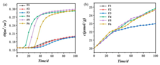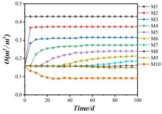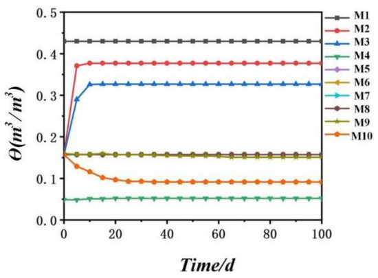 Working Condition 3 simulated the migration rule of water and salt in soil under the influence of groundwater. Figure 14 shows the change in water content value of M1–M10 at the observation points. According to Figure 14, Observation Point M1 was within the range of groundwater and had a high water content that was unchanged. The longitudinal distance between the observation points M8, M9, and M10 and the groundwater area was too far, and no water arrived within 100 days. Thus, the water content was reduced due to evaporation. The water content of other points was increased due to the vertical upward migration of groundwater.