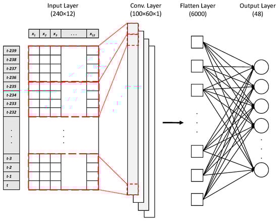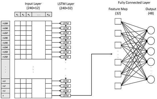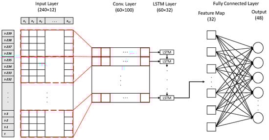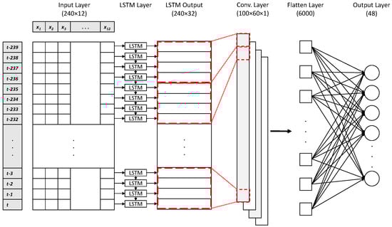 In all proposed models, the ozone concentration at time is predicted based on parameters observed between and t, where and h is 240 h (past 10 days). At any time step, the input data are represented by 10 key parameters, including 7 meteorological parameters and 3 air-quality parameters. Moreover, 2 additional parameters related to air quality are added to the input parameters: the average and maximum of for the past 8 h. Overall, the input of all models is a matrix with a shape of , and the output is a vector with the size of 48.