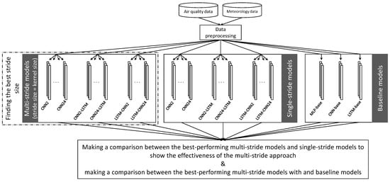 In order to show the effectiveness of involving the ozone evolution phases in the deep learning models on the prediction performance, we conducted two types of experiments. Firstly, we evaluated the effectiveness of the feature engineering approach, including filter and stride sizes based on the ozone evolution phases, on the performance of three groups of models: CNN, LSTM-CNN, and CNN-LSTM. Then, the best-performing multi-stride models and their corresponding single-stride models, described in Section 2.3, were chosen for a more detailed analysis. Finally, a monthly evaluation was conducted on the baseline and the best-performing models. To assess the significance of feature engineering on the performance of the proposed models, the paired t-test was conducted on monthly performance results. Figure 7 shows the conceptual framework of this study.