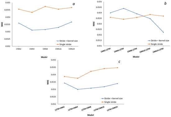 Mean absolute error of single and multi-stride: (a) CNN model, (b) CNN-LSTM model, and (c) LSTM-CNN model over different kernel sizes.