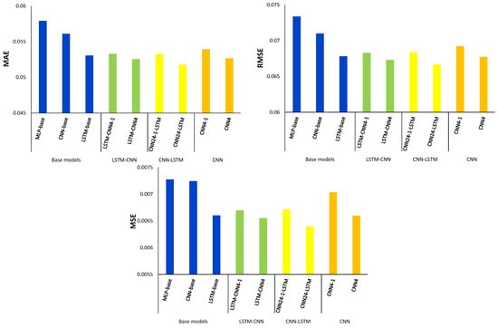 According to the results shown in Table 3, there were 3.58%, 1.68%, and 3.37% improvements in the mean performance (average of MAE, MSE, and RMSE) of the proposed CNN4, LSTM-CNN4, and CNN24-LSTM relative to their corresponding single-stride models, respectively. Moreover, the averaged performance of the proposed CNN4 model was 6.56% higher than the CNN-base model.