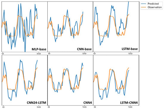 As a qualitative analysis, a 48 h forecasting instance of the proposed and baseline models associated with the Esenyurt air quality monitoring station is shown in Figure 10. Among the baseline models, MLP-base shows the worst prediction. According to this 48 h example forecast, as shown in Figure 10, CNN4 and LSTM-CNN4, which fully support our hypothesis, predict the peak ozone concentration better than the CNN24-LSTM, although CNN24-LSTM achieves the best yearly performance.