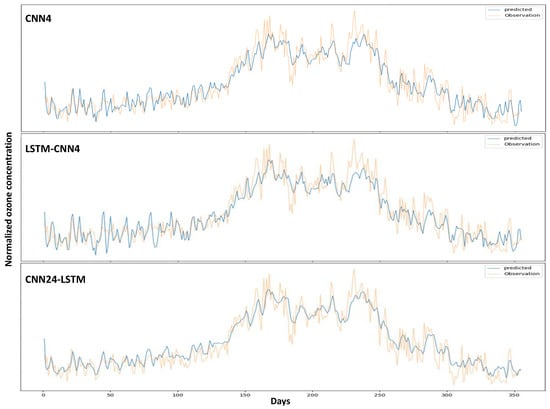 Figure 11 illustrates the observed and predicted ozone concentrations over the test set belonging to 2019 using the proposed models. The graphs indicate a better performance of the CNN24-LSTM model during the winter and early spring period (days 0 to 100). As seen, the peak ozone levels are better predicted by the CNN24-LSTM model and a smoother forecast is produced, although these points are underpredicted by all of the models. On the other hand, it is observed that the minimum ozone levels are overpredicted by the models.