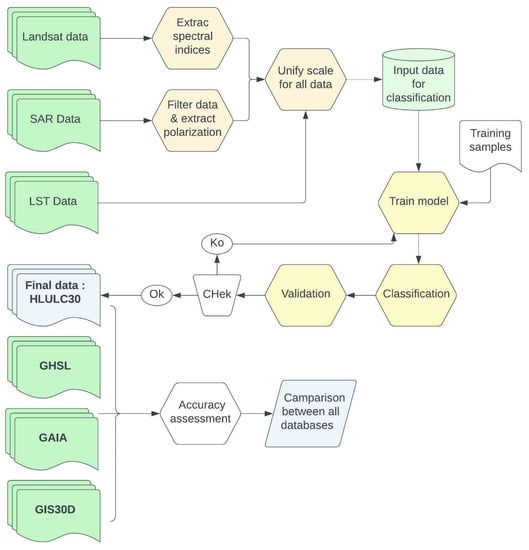 The proposed method entails making a classification and then comparing the results to previous databases to determine the consistency of the hybrid approach used in this study. The detailed processing chain used to extract and compare the accuracy of the new hybrid LULC data is depicted in Figure 1. The processing chain is comprised of three major steps: (1) input preprocessing and training dataset; (2) apply classification of preprocessed time-series data; and (3) compare the obtained results to those of similar existing databases.