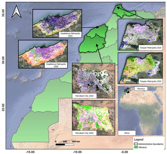 Casablanca, the third study area, already existed in the form of a city, the “Old Medina,” in 1900, with more than 20,000 inhabitants spread across 47 hectares. The birth of the French city began in 1907, near the port and the old medina, with the appearance and construction of the city’s nucleus, which would quickly expand. Following the establishment of the French Protectorate in 1912, the urban space of Casablanca underwent numerous changes because of major decisions made by colonial authorities, most notably establishing the city as the country’s economic capital [58]. Following independence, Casablanca was left to its own devices, and its urban space was subject to fragmentation caused by spontaneous development, which peaked in the 1970s, causing it to stretch in all directions, particularly to the south and south-east, despite a few attempts at planning, which were partial in nature and lacked grand designs or a forward vision. Figure 2 depicts the geographical location of the three cities that were examined using satellite images to reveal the change in their urban fabric between 2000 and 2020, with the urban fabric depicted in magenta colors in all images, while new dates (e.g., 2020) show a dark magenta color and old dates (e.g., 2000) show a light magenta color. For OLI and TIRS data, the band combination is SWIR, NIR, and Green, while for TM data, it is SWIR, NIR, and Blue.