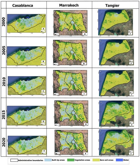 Thematic maps for 3 targeted cities: (A) 2000, (B) 2005, (C) 2010, (D) 2015, and (E) 2020.