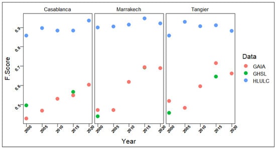 F-score in the 3 databases (GHSL, GAIA and HLULC) between 2000 and 2020.