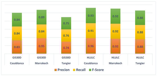 Another comparison was made between HLULC and another database, Global 30 m Impervious Surfaces Dynamic Dataset (GIS30D). The latter is the most recent database generated on a global scale. It is a precise dynamic dataset of 30 m impervious surfaces at the global scale, based on Landsat time-series images for the period 1985 to 2020. The comparison in this study was conducted for the year 2020. As shown in Figure 5, the evaluation metrics revealed that the HLULC F-score is slightly higher than the GIS30D F-score in the three test areas. This leads to the first conclusion that in a complex feature space such as urban areas, the classification approach based on a machine learning algorithm is the most accurate compared to classical spectral indices.