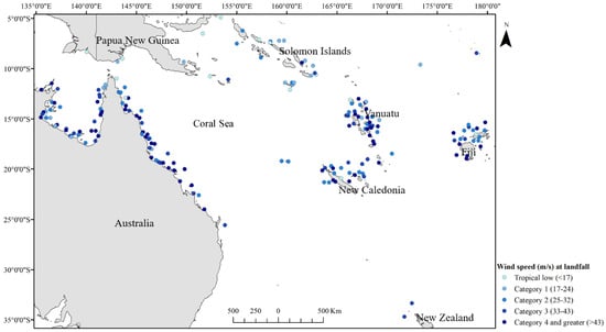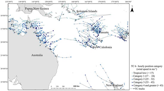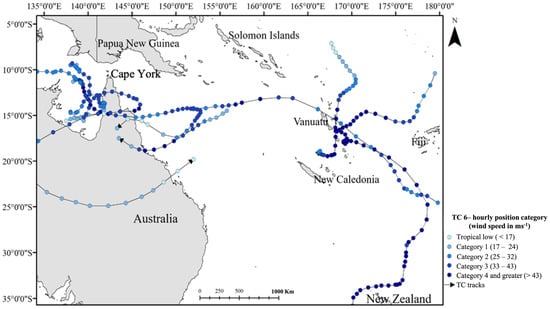 Tropical cyclones (TCs) that originate over the western region of the Southwest Pacific Ocean (5° S–40° S, 135° E–180° E) can devastate the north and northeast coasts of Australia, New Zealand, and the islands of Melanesia (including Vanuatu, New Caledonia, and Fiji). The region from the northern territory to southeast Queensland is the most developed, urbanized, and populated area of Australia, making this region extremely vulnerable to the impacts of extreme TC wind speeds. TCs are an annual threat to northeastern Australia []. The threat is exacerbated in the far northeastern region of Australia because of the complex terrain’s proximity to the coastline, increasing the destructive potential of landfalling TCs []. Western Southwest Pacific Ocean (SWPO) islands such as Vanuatu, Fiji, and Solomon are also vulnerable to TC landfalls [] because of the unfavorable shoreline to land area ratio [] and combination of low-lying coral atolls, reef islands and volcanically composed islands []. The western SWPO islands also contain a large proportion of the world’s biodiversity. Intense landfalling TCs with higher intensity in a changing climate pose a threat to these natural and human habitats and the situation becomes worse because of the limited amount of financial security, mitigation and adaptation strategies [].