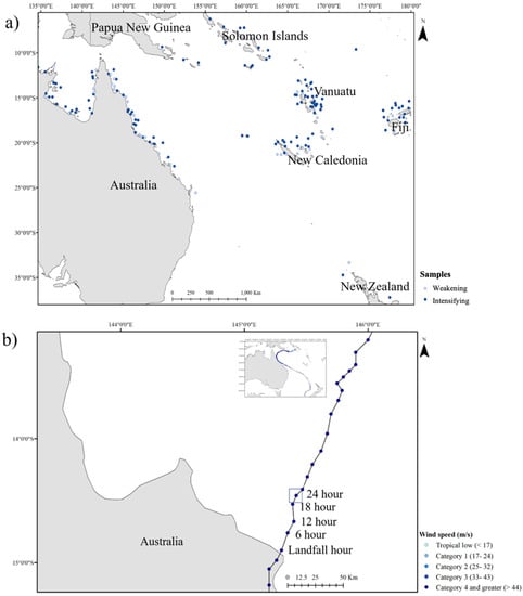 This paper utilizes the Southwest Pacific Enhanced Archive for Tropical Cyclones (SPEArTC) best track six-hourly data from 1980 to 2018 to extract the geographical position and Vmax of each storm, including six hours to twenty-four hours prior to their landfall. Storms generated within 5° S–40° S and 135° E–180° E are considered for this study. Determining the precise time and location of landfall is crucial. The National Hurricane Center defines the term landfall to be where the surface center of a TC intersects with the coastline []. However, the exact time and location of a TC landfall is sometimes difficult to identify. The TCs that made landfall within the study region have been categorized into the following two groups: (1) mainland Australia landfall TCs, and (2) SWPO island landfall TCs (Figure 1). This study considers only the first landfall when a TC intersects the land for the first time. For both mainland and island cases, when a TC first crosses land, the closest hour prior to the intersection is considered as the landfall hour in this study. Storm hour after making landfall was not included because of the land influence on the intensity. If the Vmax at the landfall hour increased or remained the same 24 h prior to landfall, the TC is considered as intensifying (labeled as 1) (Figure 2a). If the Vmax at the landfall hour decreased from 24 h prior to landfall, the TC is considered as weakening (labeled as 0) (Figure 2a).