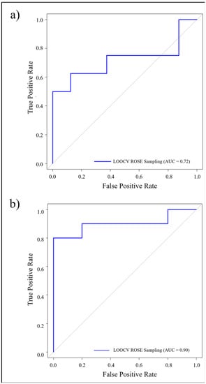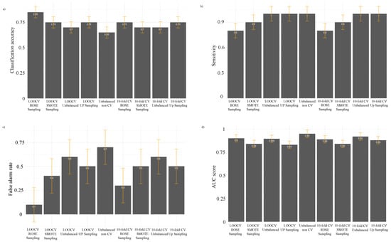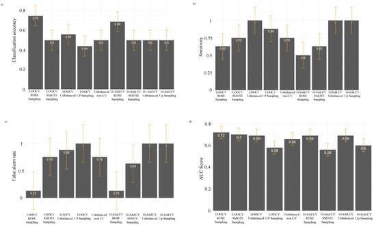 Classification accuracy is the ratio of the number of correct predictions to the total number of input samples. However, it will provide higher accuracy for the class that contains the higher number of cases if the sets are unbalanced []. A classification data set with skewed class proportions is called unbalanced. Several studies have found class imbalance to be responsible for the low accuracy of traditional classification models, including linear discriminant analysis [], support vector machines [], and classification trees []. An approach to handle this issue is to re-balance the training data set by applying different sampling techniques, including oversampling of the minority class, the synthetic minority over sampling technique (SMOTE) sampling, and random over sampling examples (ROSE). Sampling methods preprocess the data, which includes constructing a balanced data set and adjusting the prior distributions of the majority and minority classes [,].