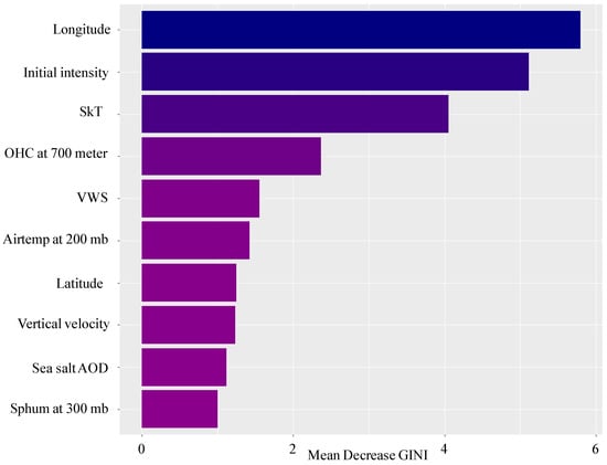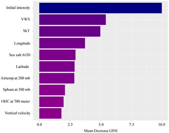 Several geophysical and aerosol variables are used in this study as input variables. Geophysical and aerosol variables that correspond to each sample are extracted from the nearest grid cell to each storm point 24 h before landfall, rather than considering domain averages to ascertain a localized picture of the relationship. Gridded multidimensional atmospheric, oceanic, and aerosol variables that were spatially and temporally closest to the 24 h prior to landfall were collected for each sample. The input variables considered in this study are latitude, longitude, Vmax (ms−1), vertical wind velocity (VW), sea surface skin temperature (SkT), ocean heat content (OHC) at a 700-meter depth, specific humidity at 300 hPa (sphum), air temperature at 200 hPa (airtemp), 850–200 hPa vertical wind shear (VWS), and sea salt extinction aerosol optical depth (SSAOD) at 550 nm (Table 1). TCs escalate upper ocean mixing and SST cooling during intensification []. SST can influence TC maximum intensity through its influence on upper atmospheric temperatures []. In addition to a warmer SST, TC intensification or weakening is also affected by the vertical thermodynamic properties of the atmosphere []. The historical upper tropospheric temperature has increased significantly faster than the tropical mean, and the warming of the upper troposphere controls TC intensification, which is associated with ocean warming [,,,,]. Thus, considering the upper troposphere is important to better understand the thermodynamic influence on TC intensity.