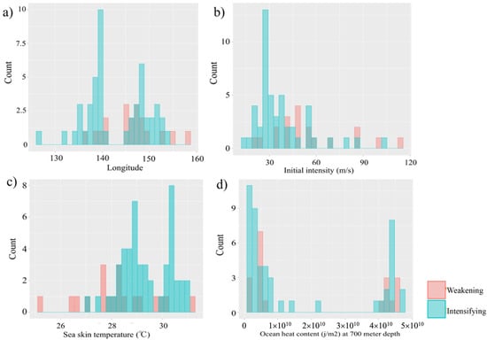 Histograms showing the frequency distribution of (a) longitude, (b) initial intensity, (c) SkT, and (d) OHC at 700 m for the intensifying and weakening cases of the Australia mainland landfall TCs. The four most important variables were identified by the LOOCV.