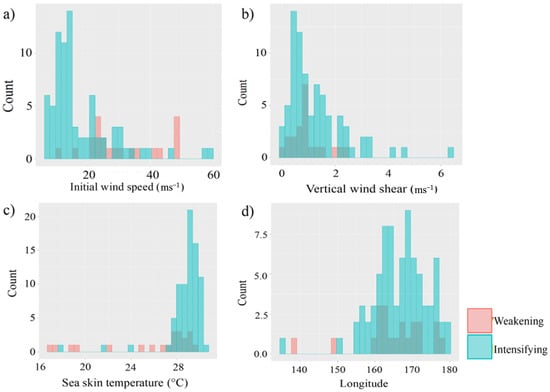 Figure 9 ranks the importance of each variable according to the MDG value in classifying TC intensification and weakening for the island landfalls. Island landfall TCs are comparatively smaller in spatial scale because of the terrain characteristics and the bathymetric influences. Initial intensity is ranked as the most important variable in the TC intensity classification, with weakening events ranging from 11 to 48 ms−1, with the majority higher than 26 ms−1, and intensifying events ranging from 10 to 16 ms−1. The weakening events may have already reached their lifetime maximum intensity as they approached the coast, leaving no room for them to further intensify. The intensifying events, however, are at their earliest stages and just started to enter a favorable atmosphere for TC intensification, so they continue to intensify regardless of the presence of the island. Figure 10a shows that the majority of the intensifying cases have very low initial intensity (less than 20 ms−1), whereas the weakening cases have 20 ms−1 to 50 ms−1 initial intensity, which matches with the findings reported by ref. [].
