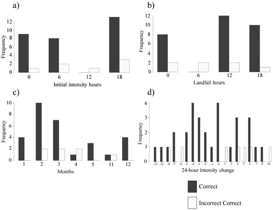 The events were sorted by their landfall hour, initial intensity hour, intensity change within 24 h, monthly distribution, and geographical distribution and compared with the correctly predicted events in Figure 11. Most of the incorrectly predicted cases occurred at 18:00, which is when most of the TCs were in their initial intensity (24 h before making landfall) position (Figure 11a). Figure 11b indicates that the early morning hour of 6:00 produced the only incorrectly predicted cases.