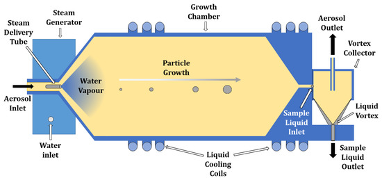 PINQ insoluble aerosol collector (IAC) diagram, highlighting major components such as the aerosol input, steam generator, growth chamber, and vortex collector. (Figure adapted from Brown et al. [42]).