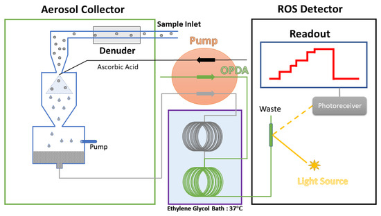 - Huang, W.; Zhang, Y.; Zhang, Y.; Zeng, L.; Dong, H.; Huo, P.; Fang, D.; Schauer, J.J. Development of an Automated Sampling-Analysis System for Simultaneous Measurement of Reactive Oxygen Species (ROS) in Gas and Particle Phases: GAC-ROS. Atmos. Environ. 2016, 134, 18–26. [Google Scholar] [CrossRef]